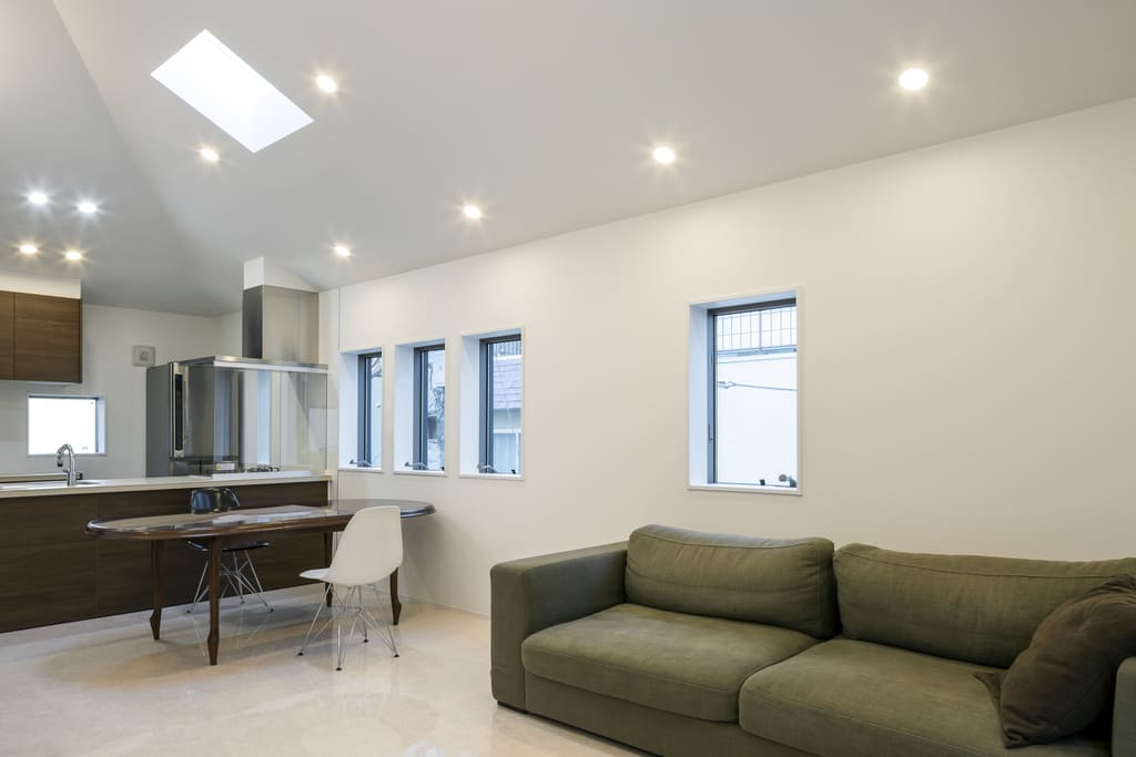 敷地の南側に外国人専用のアパートがあったため、プライバシーと換気を確保するために木製のルーバーを設けた。